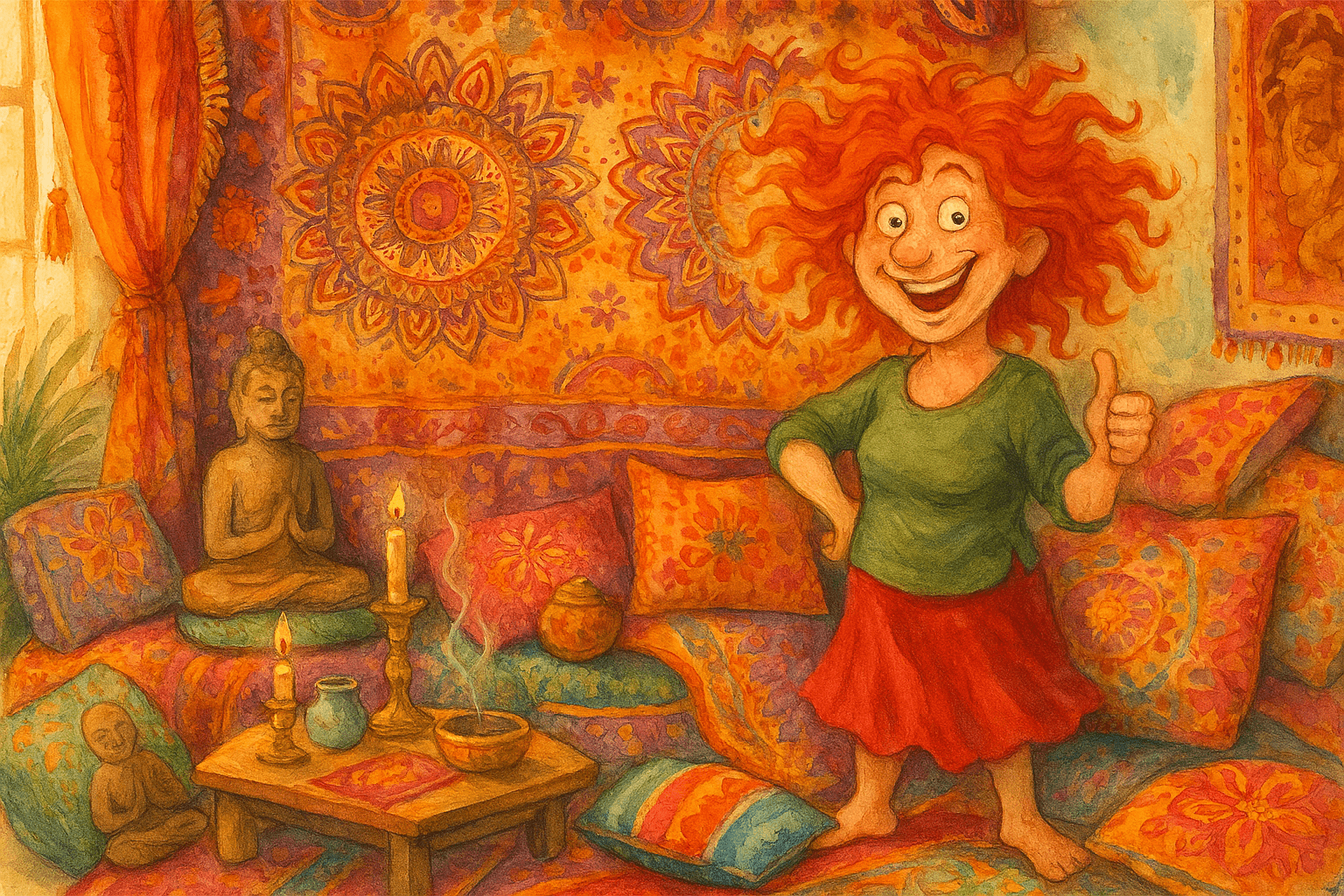 „Já si pod ten mandalový závěs vždycky lehnu s čajem a dělám, že medituju. Ve skutečnosti čumím, jestli soused zas griluje. Ale ten pocit? Nirvána.“