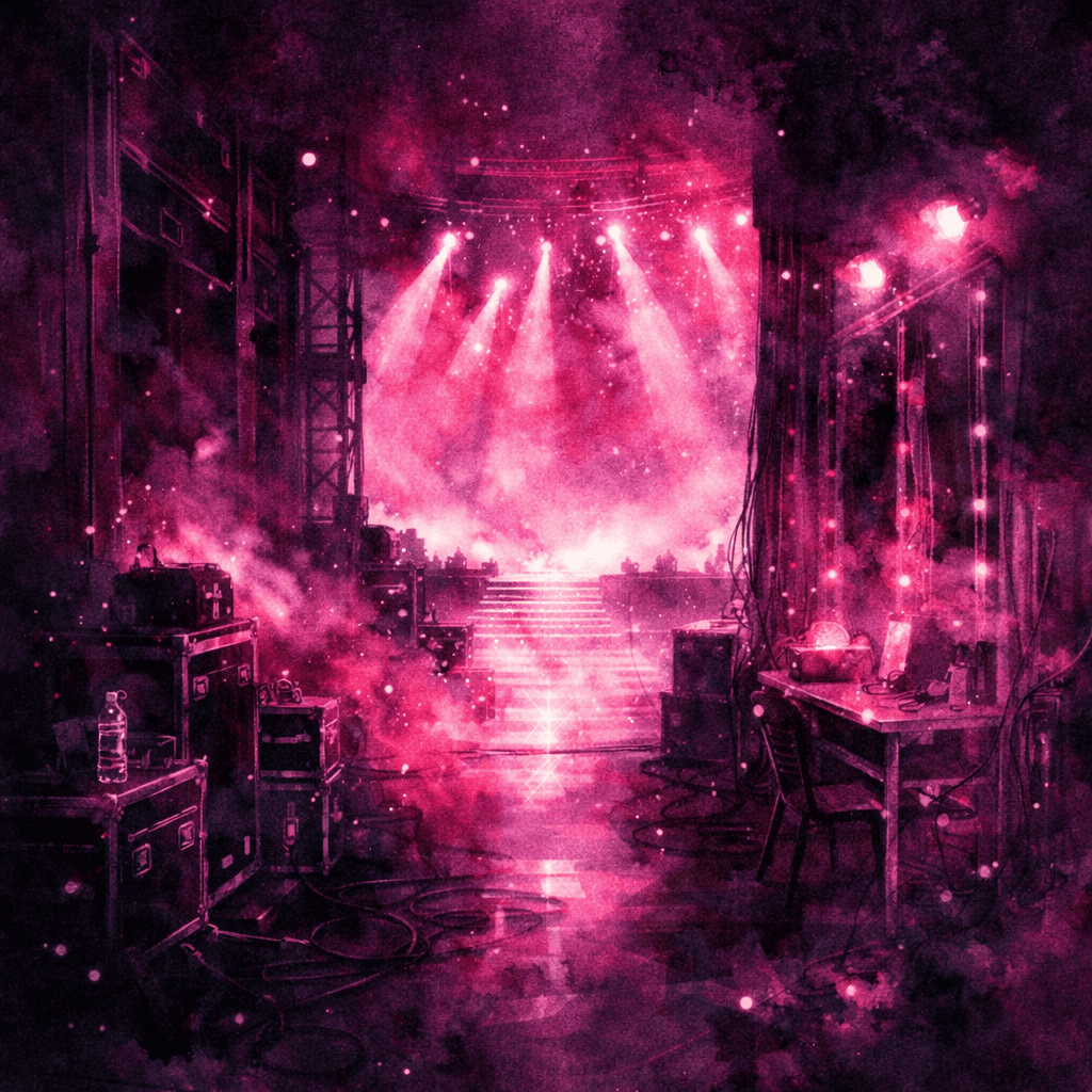 K-pop dívčí skupina kráčí na pódium pod září růžových koncertních světel těsně před začátkem vystoupení.