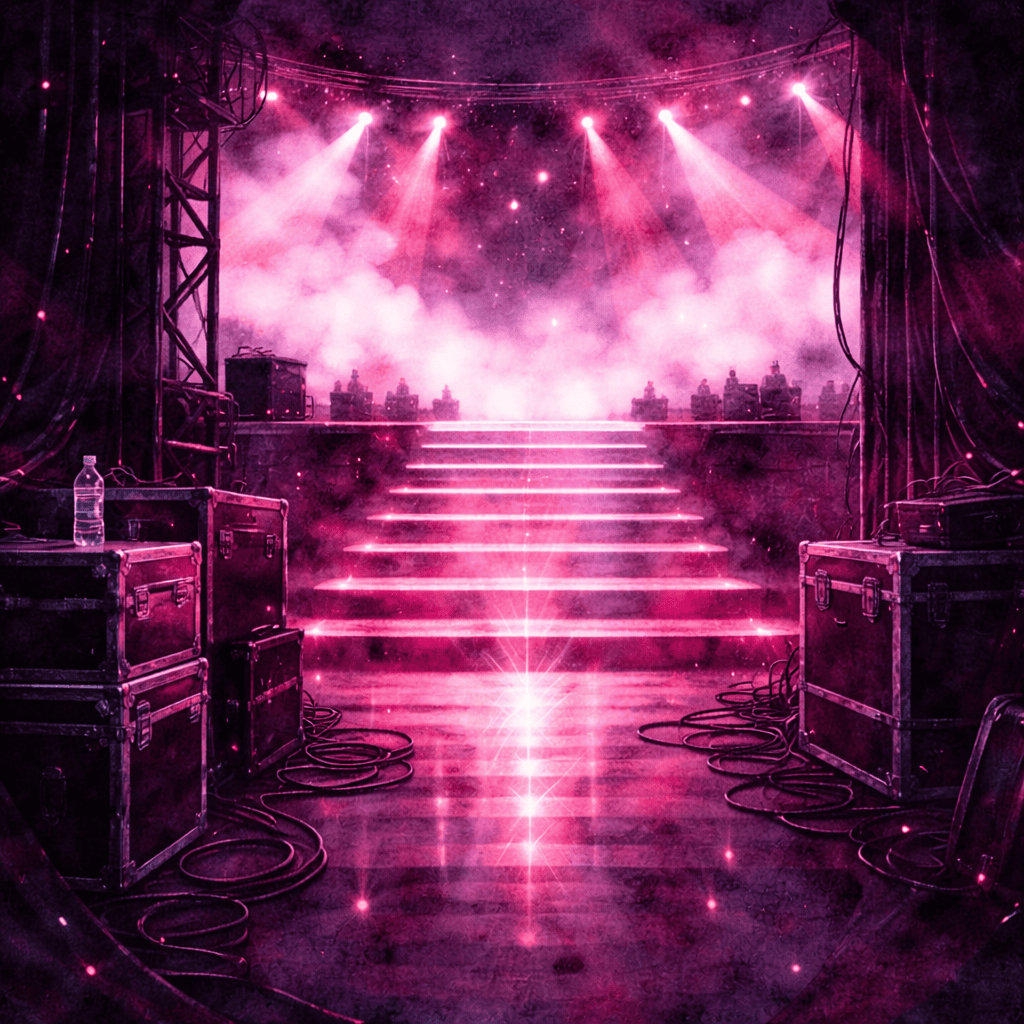 K-pop dívčí skupina kráčí na pódium pod září růžových koncertních světel těsně před začátkem vystoupení.